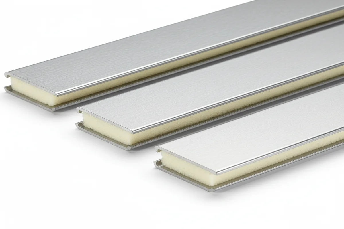 La lama extrusionada es hueca, ligera y muy resistente a la deformación. Fabricada en aleación de aluminio de alta pureza. Ideal para grandes superficies acristaladas donde el peso importa. Coste inicial más ajustado que el inyectado.